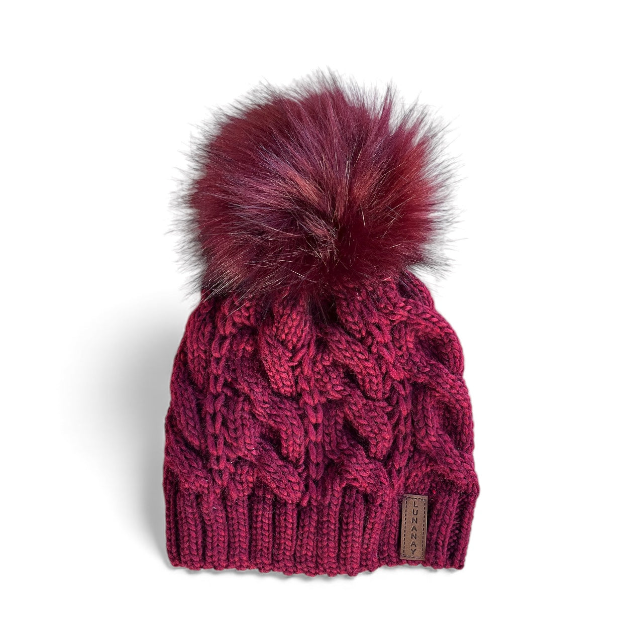 Zimní pletená čepice Lunanay 3599, vínově červená s bambulkou